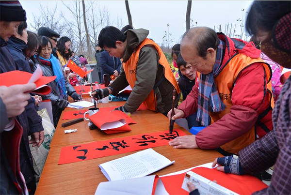 下午3时,场子一铺开,书法爱好者们挥毫泼墨、笔走龙蛇,不一会儿,一幅幅珍贵的墨宝便诞生在红彤彤的正丹纸上,一句句祝福的话语,寄托着职工居民对农历新年的憧憬和向往。活动现场,前来领取春联的职工居民三五成群,热闹非凡,其中,“春回大地,福满人间”等大红喜联最受欢迎,不一会儿便被抢选一空。
