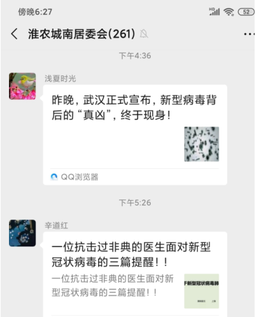 在城南居委会主任管玉兵所建的城南居民群中,现在有260多人,并且群的规模还在增加。由于这次新型冠状病毒肺炎感染疫情的特殊性,为减少有可能携带病毒引发的交叉感染,管玉兵通过微信群来告知职工居民科学防范新型疫情,并通过在群中发放农场公司出台的文件和应对疫情的应知应会等告示材料,让广大职工居民借助群的力量,来开展疫情联防联控。微信群也让基层的居委会主任解决了人不能聚集而又能办成事的大难题。