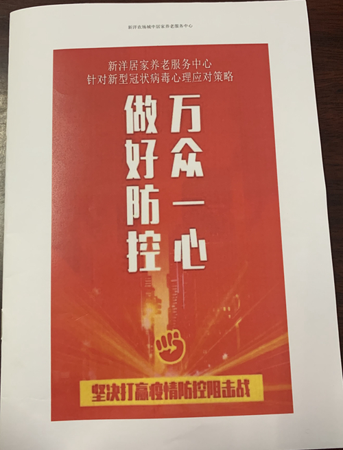 自新型冠状病毒感染的肺炎爆发以来,新洋居家养老服务中心工作人员除了积极做好中心消毒和卫生防疫等环境清洁工作外,还通过电话慰问、入户走访等形式对辖区内老人进行定期身体状况了解、体温测量,并针对老年特殊群体整理了一份《新型冠状病毒的心理应对策略》供大家参考,以增强老年人的心理免疫力和自我防护意识!