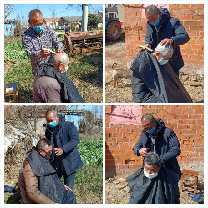 2月18日,阳光明媚,宝应湖农场公司三分场三队居民点,职工潘志国正在认真有序地为几位老人理发。