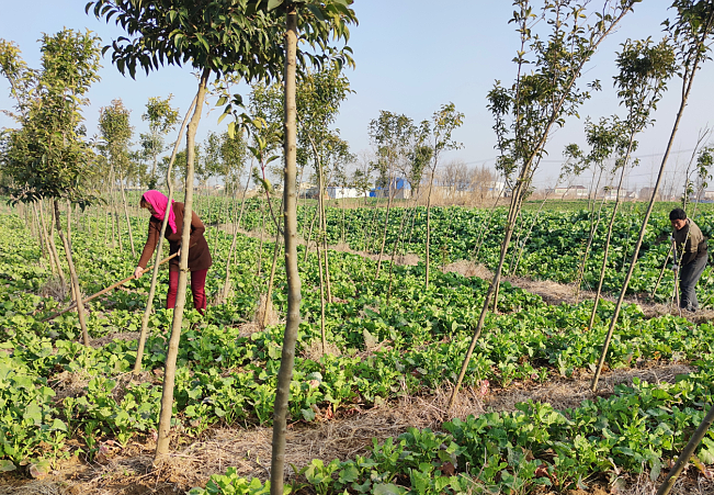 淮海在林地管理中,鼓励职工把精力投入到林下土地的套种增收上,走出了一条林地护林增收的新途径。图为农户在林下对油菜蚕豆田进行锄草时的镜头。