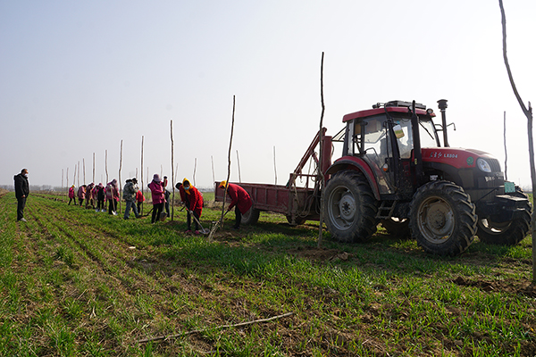 在13大队防风林作业现场,林发公司绿化工程部刚刚完成工人的体温检测工作。由于林地土壤条件限制,机械在防风林里作业难度较高,只能采取人工挖坑的方法。这些树苗都在3米左右高,每棵苗之间相隔3米,栽种2排,由南至北,一个林带可栽种600余棵。
