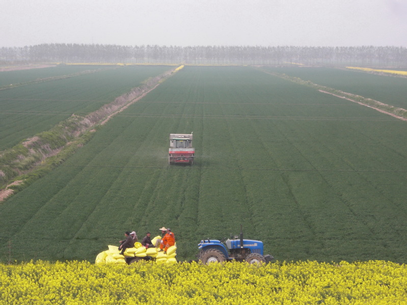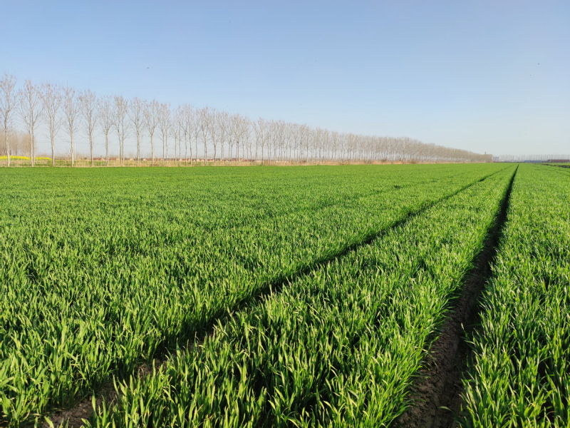 湛蓝的天空下,碧绿的麦苗在温暖的阳光下拔节生长,田间留下的机械抛肥和防病治虫时留下的印辙,显示着曾经的繁忙。田间清一色的麦苗和它们的生长姿态,让人联想到农业管理人员技术的强大。
