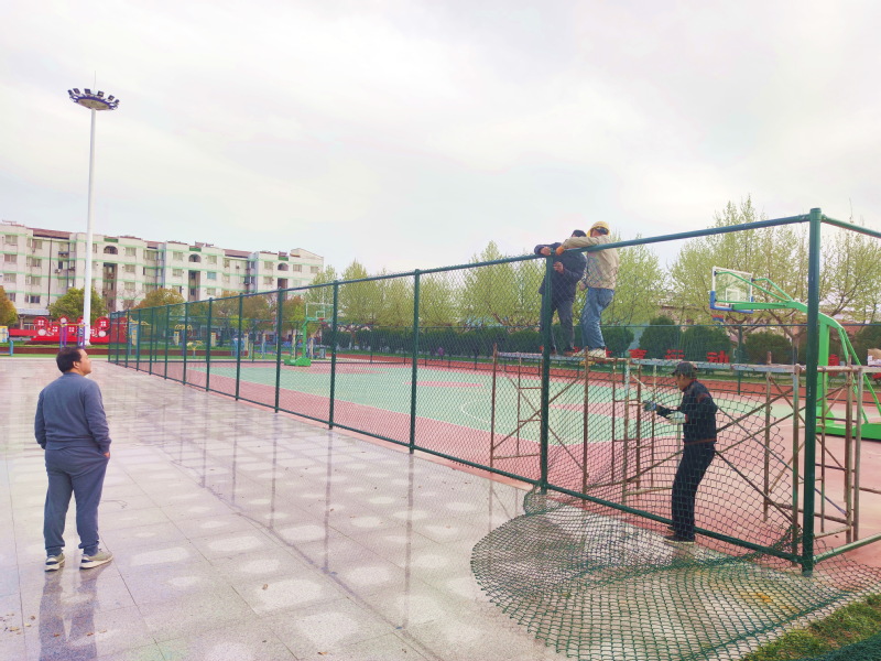 为营造安全有序的健身环境,提升职工居民的运动健身质量,4月21日,淮海职工休闲体育运动广场塑胶篮球场周边,有3名安装人员正在安装篮球场防护网,3米高的球场防护网的配置,在提升篮球场档次的同时,可以大幅度地减少打篮球、跳舞蹈、塑胶跑道散步和器材健身等健身运动的相互妨碍,让参与运动的职工居民在安全的健身环境下运动,让大家享受着健康体育生活的美好。图为安装人员正在加装防护栏时的镜头。