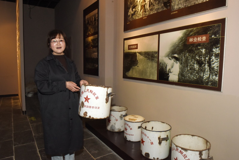 在农建四师陈列馆中,望着一件件军垦老物件,陈列馆讲解员为青年员工讲述了军垦战士当年开荒造田的历史和物件征集过程中发生的感人军垦故事,并希望青年员工要继续发扬老军垦艰苦朴素、无私奉献的军垦精神,将淮海的明天建设得更加美丽富饶。图为青年员工在听取讲解员对军垦老物件的解说。