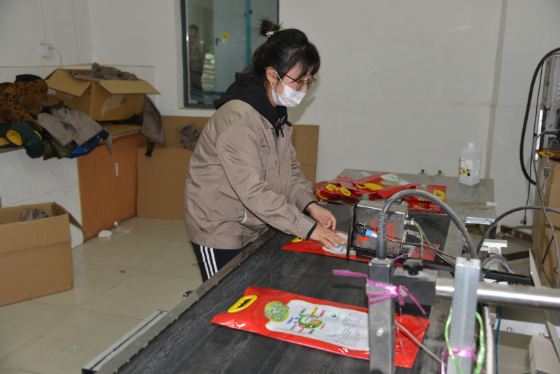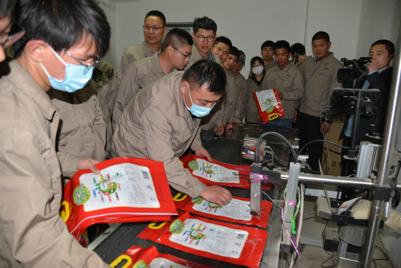 当然啦,淮海工会为了增强活动的效果,把我们还编成了若干个竞赛小组,进行竞技表演。这样让大家在劳动的快乐中,体验着大家庭的温暖和团结协作的精神。同时也在事后在大家在共同的议论中,让本次“义工行”的劳动精神得到了升华。图为大家在师傅的带领下,进行操作包装袋上操作喷码流程作业。