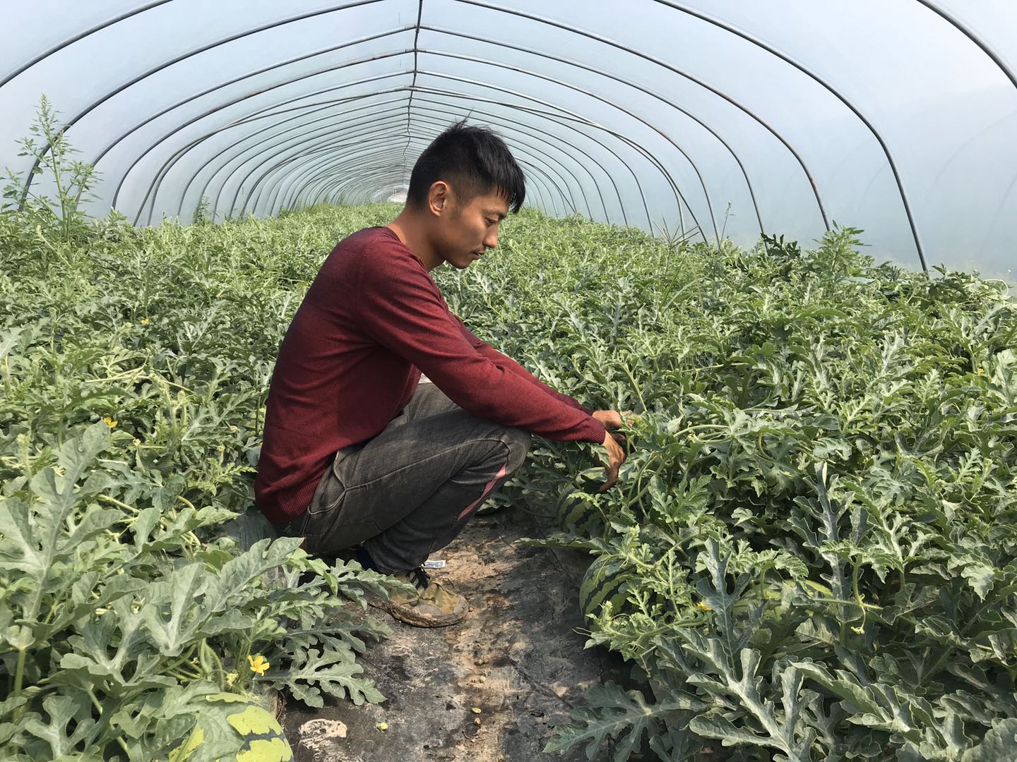 大棚西瓜的主人蒋双飞是一个80后的年轻人,这已经是他种植大棚西瓜的第六年。在这六年里他从一个“小白”成长为“种植能手”花费了不少心血。