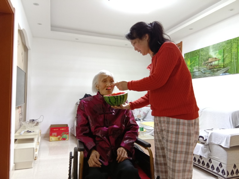 透过照片的镜头,虽然我们没有到现场,但我们大家分明看到了一副温馨的生活场景。作为女儿,不但在母亲床的一侧又置放了一张床,经常与母亲聊着,随时知晓母亲的情况,还在生活中更是无微不至地照顾着老母亲。你望,老人的床上是清清爽爽,仿佛闻到了散发着太阳的温暖,丝毫没有无人照顾的杂乱;你看,为了母亲,周粉英为老母梳头、推着轮椅散步、喂母亲吃甜甜的西瓜;你瞧,女儿为了母亲,为她喂好每一口饭,为她勤换衣服,让母亲干干净净地过好每一天。