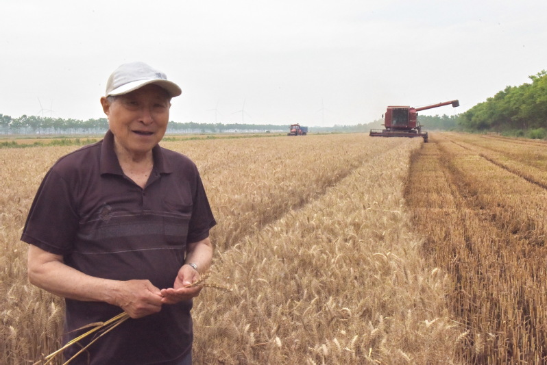 在三分场社区22大队小麦收割现场,当已经是80岁高龄的原淮海农场农机科科长江仁良,当他看到一辆凯期收割机在田间快速收割小麦的镜头时,有着浓厚农机情结的他,刚从观光车上下来,就连忙跨过防渗渠,信步来到小麦收割的田间,跟着收割机的身后,蹲下身来,拨开麦秸,用嘴吹了会儿,然后满意地站了起来,又径直来到站立的麦子前,轻扶麦穗查看穗子的大小,抬着看着行进中的收割机,脸上露出了欣慰的欢笑。看得出老农机科长对现代农业机械的发展很是满意。
