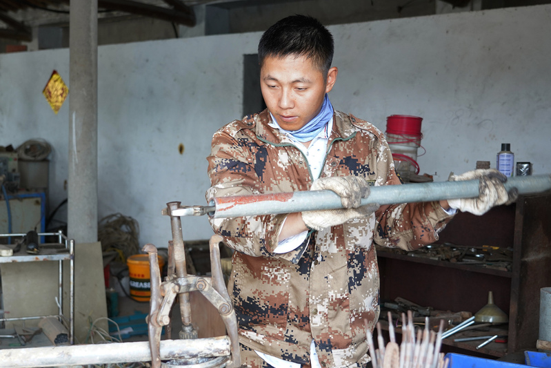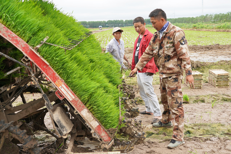 趁着插秧机驾驶员中午吃饭的空挡,蔡金放下手上农机修理的活又赶到了第五生产区17连16号田间,检查插秧机的状况。擦去秧针上的烂泥,用尺将三台插秧机的机针一根根量过去。“今天秧针都换过了吗”?“全换过了”。“机上有三根针磨损严重啊”!“今天在田里碰到石头了”。“你机上的针根本就不是我发给你的那种”。“我这是机上原装的,能多用几天”。“三台机,赶紧都换了再下田插”!昨天要求插秧机驾驶员将秧针全部换了再插,面对驾驶员的推搪之词,蔡金干净利落地将每一台插秧机的取苗情况检查了一遍。
