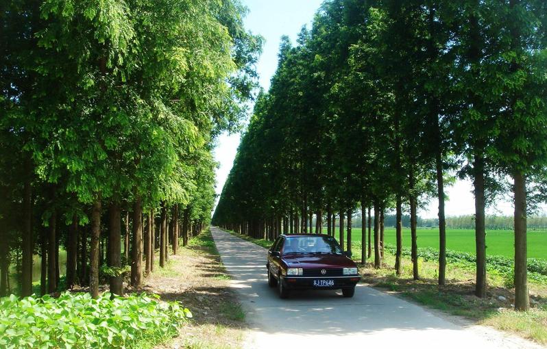 高高的水杉树,立于公路两旁排着整齐的队伍,如亭亭玉立的少女,组成欢迎你的仪仗队,微风吹过树叶的沙沙声,如“欢迎!!欢迎!”的绵绵细语,似悠扬悦耳的迎宾曲。