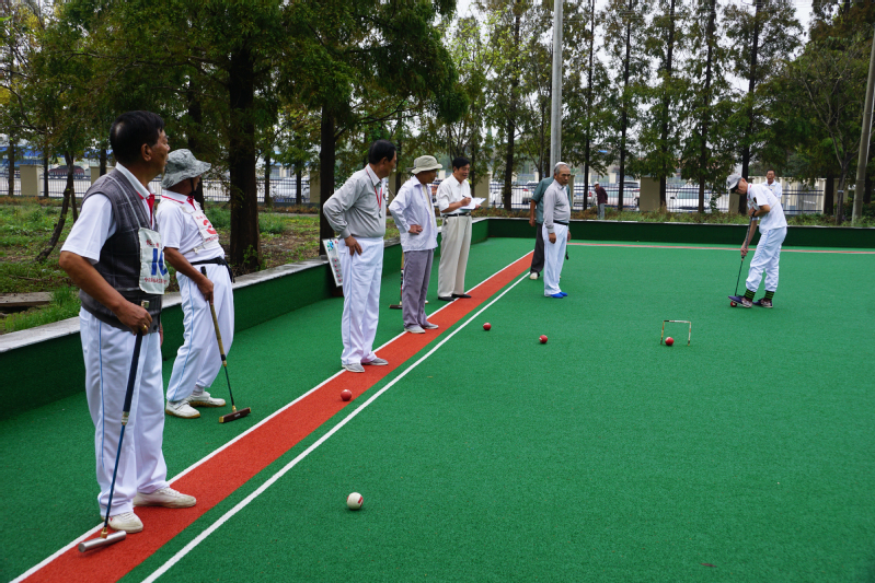 赛场上,只见双方球员都是精神焕发的老年“球手”,他们都是农场门球协会会员。大家斗志昂扬,手握重槌,气定神闲,挥杆对垒,沉着冷静,弯腰击球也显得身手矫健,精湛、娴熟的球技,获得了观众们的称赞。