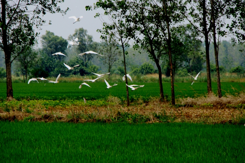 万绿丛中点缀着点点白鹭,或而伫立田埂或田间,或而展开双翅低低飞翔,动静结合,给绿色的田野注入了生气和活力。