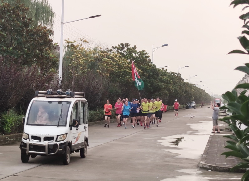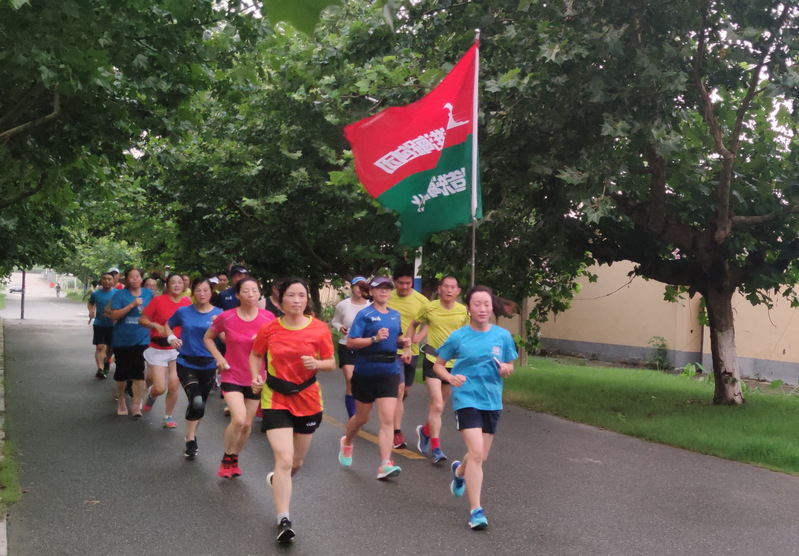 据此次活动的负责人介绍,淮海跑团目前在周一和周四两次的下班后进行健身跑步,旨在倡导用科学、健康、文明的健身方式,增强职工居民的体魄,提高身体素质,并为农场开展的体育健康文化造势。图为淮海跑团的跑友们在长跑行进中的镜头。