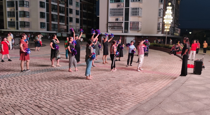 8月10日傍晚,在淮海农场社区门前的文化广场上,喷泉栏杆上的社会主义核心价值观和文明创建标语也非常醒目,栏杆内不断变幻的音乐喷泉旁,吸引了一波又一波的孩子前来观看。农场社区的职工居民此时也纷纷来到了文化广场上,进行健身运动。一些孩子和家长正在周边游玩得兴起,一派和谐而又温馨的场景洋溢在大家的心头。