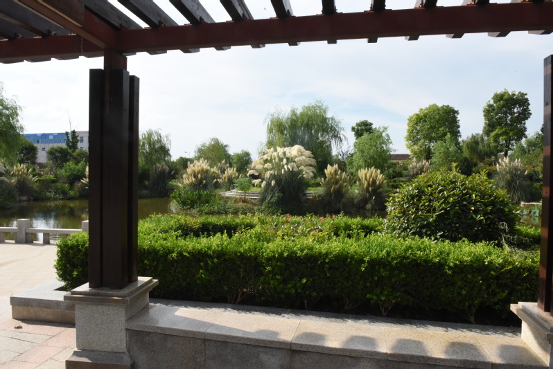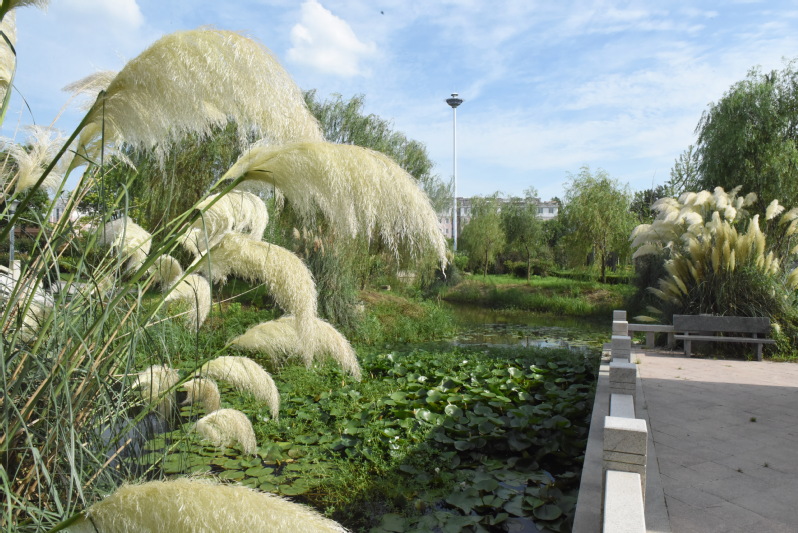 处署时节,要入在淮海农场淮海公园中什么最美丽,大家一定都把手指向了公园中到处绽放着花序的蒲苇了。烈日下站中公园的长廊下,享受着荫凉的惬意,欣赏着远近开放的蒲苇草,此时的心情甭提有多开心了。虽然公园内花卉开放的不是很多,但在绿色一片的植被中,那些置身于河边、石旁、亭边的那一簇簇高大的蒲苇草展现出来的,无数银白色的大型圆锥花序,宛如素净少女般婀娜多姿,清丽婉约中又显风情万种。他们好像是在公园内旁若无人般地肆意开放着,如花如景更如情,亭亭玉立地自成一景,又融入到周边的绿植和造型的景观里,让在此流连的职工居民无不驻足观赏,手机中留下它美丽的风景。
