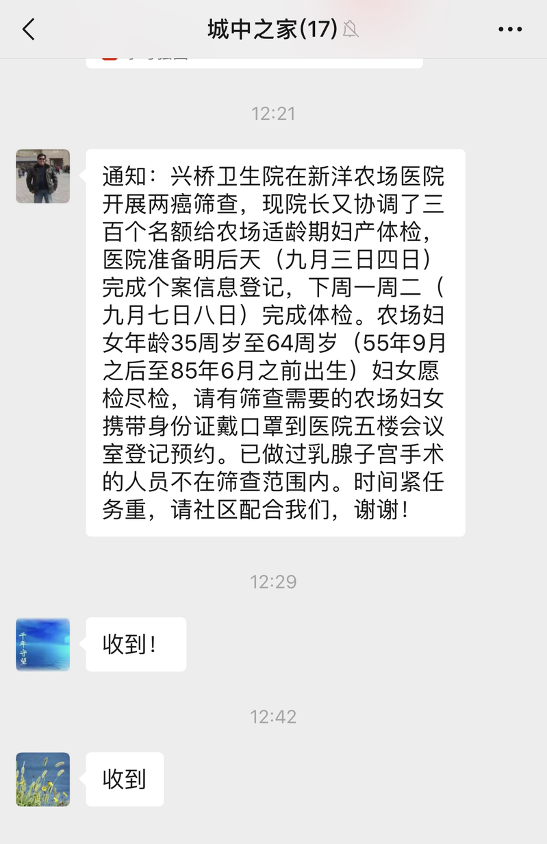 为确保适龄妇女都能享受到国家的惠民政策,社区相关部门向场域内适龄妇女宣传“两癌”防治知识,切实提高广大妇女的自我保护意识,努力形成良好的筛查工作氛围。此次农场妇女享受“两癌”免费筛查年龄在35周岁至64周岁(1955年9月之后至1985年6月之前出生)之间,兴桥镇卫生院新洋农场分院于9月3日至4日完成个案信息登记,9月7日至8日完成体检。