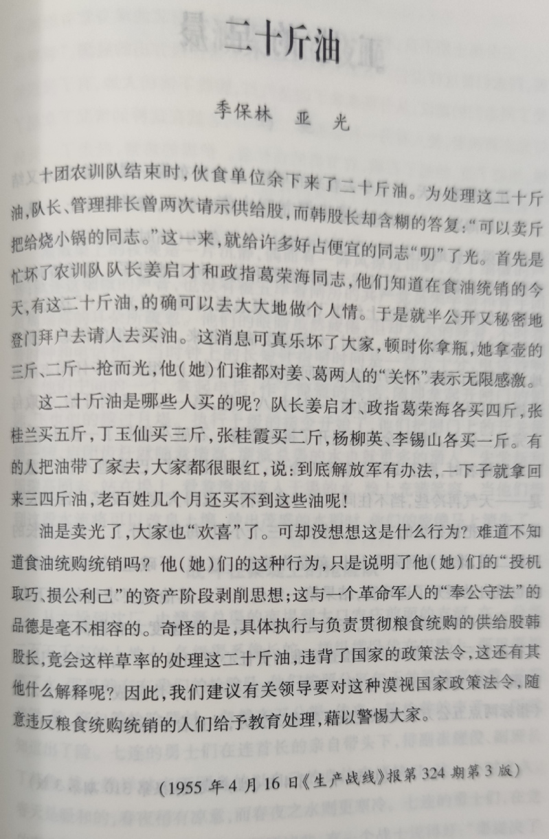 附:1955年4月16日第324期《生产战线报》3版由作者季保林和亚光共同采写的《二十斤油》的版面内容。