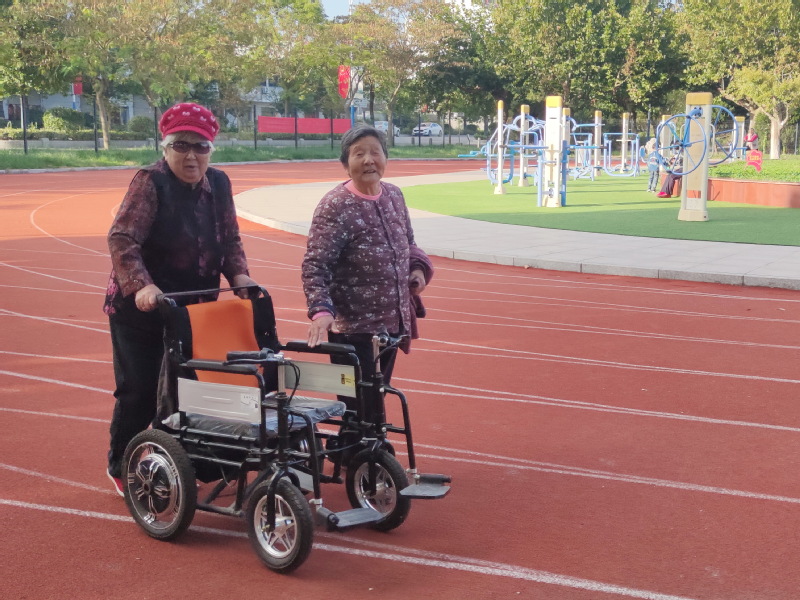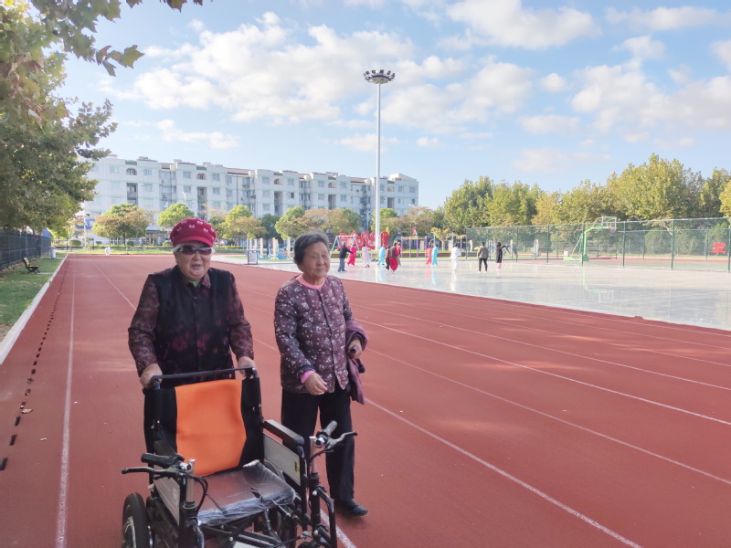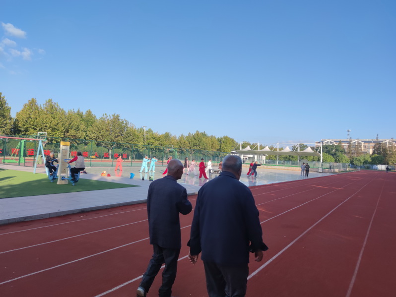 天上白云悠悠,太阳把蓝天照耀得分外清爽;广场内音乐阵阵,大家按照各自的健身规律进行着运动。我们注意到,有一个推着轮椅的老人和另一个老姐妹在相伴散步,瞧他们聊天的神态是那么的自然,交谈起来甚欢。另外有两个80多岁的老人,在塑胶步道上一圈又一圈的踱着步,以迈开腿的姿态进行健身。据这些都已经过了80岁的老年人讲,他们每天都要来到广场这里来走上七圈八圈的,这样才能让自己的身体时常充满活力。