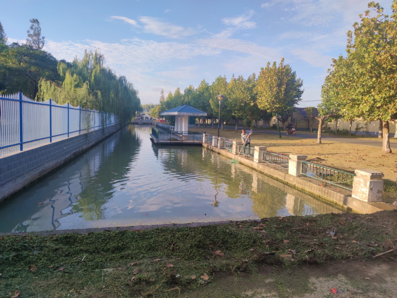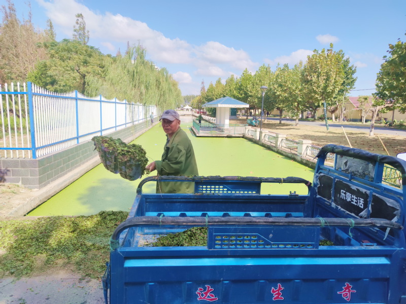 两天时间在清除浮萍的过程中,不但河道里面没有了绿色污染物了,更重要的是水变清了,环境变美了,农场的小城镇也变得更加漂亮了。图为环卫人员在清除浮萍和河道清洁后时的镜头。