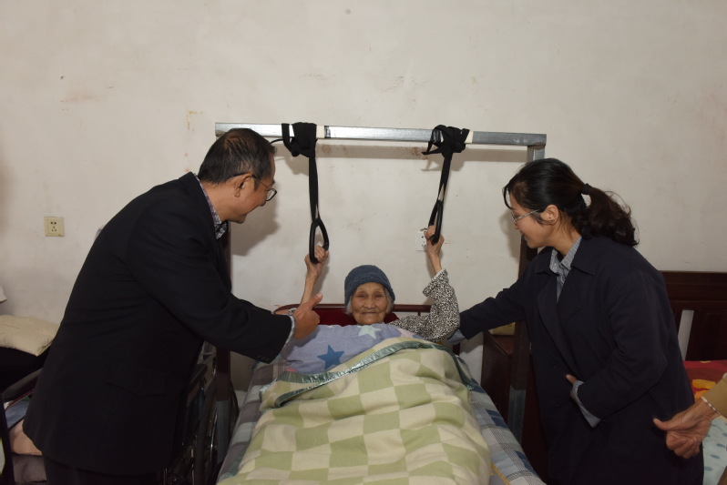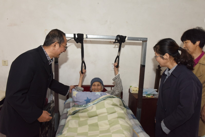 10月27日上午,重阳节第三天,淮海农场工会和社区老龄委负责人深入辖区走访看望农场健在的3位百岁老人,并为老人送上慰问金和节日的问候。当慰问人员还来到了农场振兴小区,向居住在女儿家并瘫痪在床上的丁吉女表达节日的问候,递上了慰问金时,大家对悬挂在床上方的吊环表现出了浓厚的兴趣。