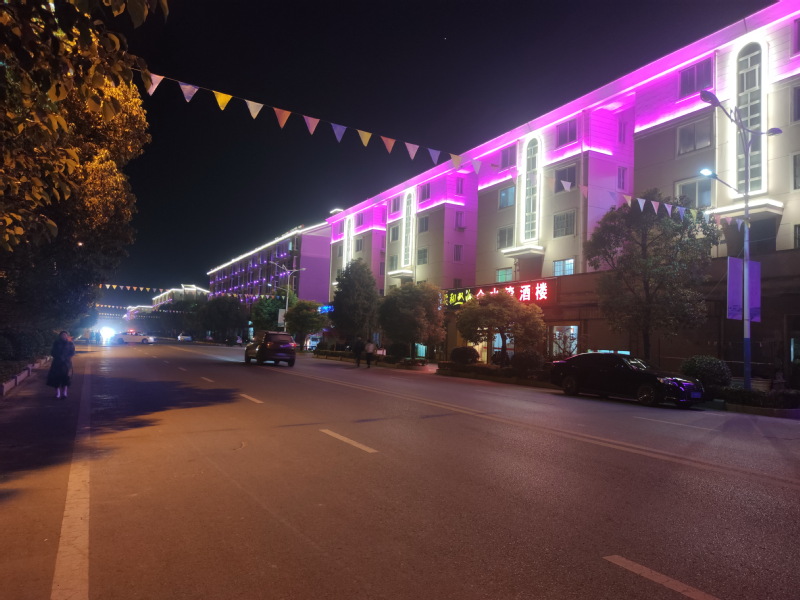 淮海路是农场的主干道,四车道的道路加上两边的停车线就有近30米,两边香樟树茂密,紫薇花装点,红叶石楠搭配,路灯中的彩旗穿插其间,营造出了优美的淮海路绿化环境。农场的建设者们,为了让农场的夜色更有亮点和特色,也让生活在这里的人们更有幸福感,通过夜间楼宇的亮化工程,让道路两边及文化广场周边的楼宇轮廓灯、星灯、招牌灯、射灯及霓虹灯绽放在夜空,十分漂亮和养眼。