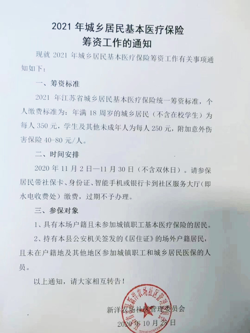 近日,笔者从新洋农场社区公共服务科了解到,新洋2021年度城乡居民基本医疗保险参保缴费工作已全面启动。今年,城乡居民基本医疗保险个人缴费标准为每人350元,学生及其他未成年人为每人250元,附加意外伤害保险分别为40、80元每人。