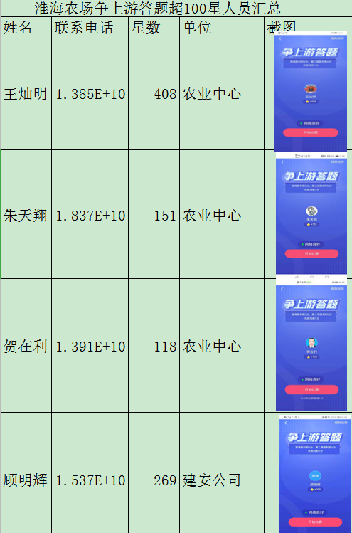 在射阳县学习强国工作群组织的全县各党委学习组织所有“学习强国”学员争上游答题超100星人员的情况统计中,淮海农场农业中心的王灿明、朱天翔、贺在利等三人和农场建安公司的顾明辉,他们分别在平日的学习强国答题活动中,分别以408、151、118和269颗星入选超百星人员行列,成为淮海农场在学习强国学习活动中新的标杆,促进了广大党员同志跟进学习的步伐。图为申报县学习强国平台的学习强国截图名单。