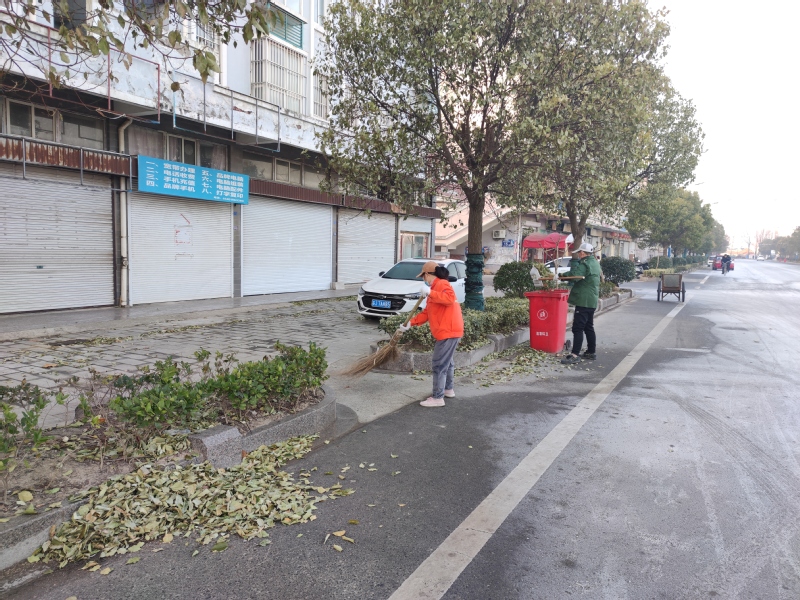 由于前期农场遭受到了零下十一二度的冻害,加上近期太阳较好,被冻死的香樟树叶迅速失水干瘪,特别是淮海路栽植的香樟树较大较多,落叶堆积较多,为进一步提升了农场小城镇的形象,为即将来临的新春佳节营造出良好的环境氛围,近日来,淮海农场绿化环卫所不但加强了沿路环卫职工对树叶等杂物的清扫力度,还组织环卫职工开展突击清理绿化带内的杂物垃圾,作业人员利用专门订制的“钉耙”扫帚或是夹剪将杂物捞出,然后用编织袋统一装袋,集中运走,为生态美丽淮海营造出亮丽的色彩。图为环卫职工们在清扫路面时的镜头。