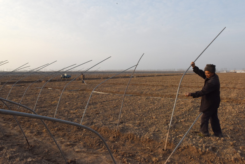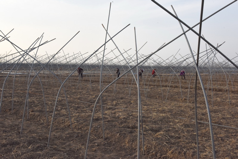 大面积连片在淮海进行的西瓜种植,不仅让怀揣技术、经验、资金和市场的淅江瓜农借助农场小城镇的集聚效应,借助充足的劳动力获得增收的红利,同时西瓜地大棚搭建及今后棚内的各种管理措施,可以较好地带动农场的职工居民和周边农村的群众,借西瓜种植基地的繁育种植和市场销售,而实现他们在“家门口”打工创收的梦想,有力地带动了广大职工居民和农村群众借农机和劳务来实现增收。图为职工群众在大棚基地里进行劳作时的镜头。