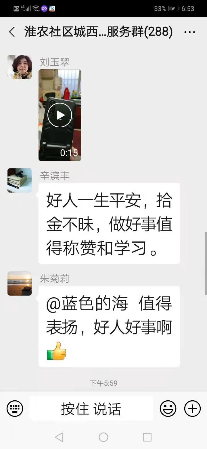 短视频发到群里不到两分钟,就有群友回应了。有夸刘玉翠拾金不昧的,也有主动将短视频发到其他群的,大家一起帮助寻找失主。说来也巧,家住淮海农场五星小区三号楼的孙女士,在居民服务群看到寻找手机失主短视频后,左看右看,视频上的手机很像自己老公的智能手机。她连忙叫来老公蔡某某,让他先看视频,蔡某某看过视频,下意识的摸了口袋,这才发现手机没了。他赶紧用夫人的手机拨通了自己丢失的手机。刘玉翠接到手机电话,让蔡某某不要着急,然后把自家住址告诉他,等他来取。因蔡某某家里没有电动车,刘玉翠主动就骑上电动车,将手机送到蔡某某的家里,蔡某某拿到手机,夫妻二人连声感谢。刘玉翠笑着说道:不用谢,小事一桩,手机找到就好。