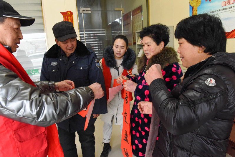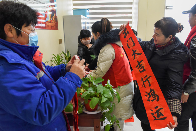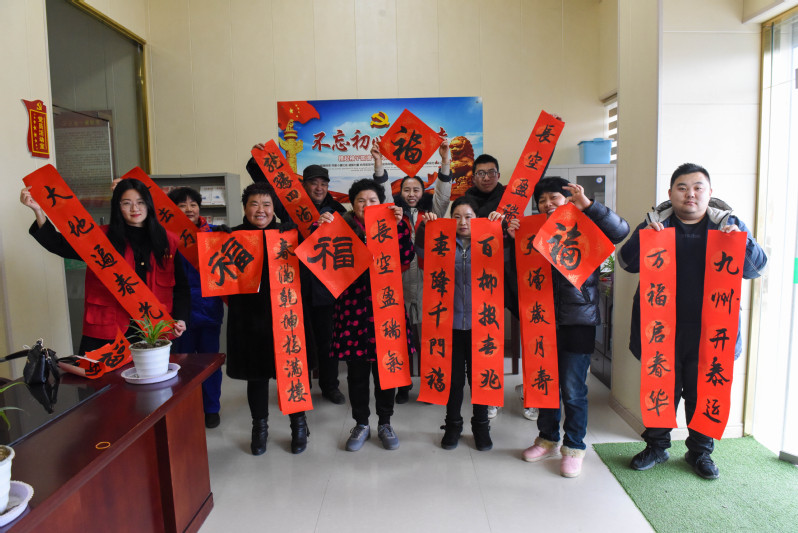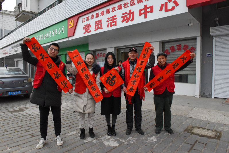 在节日期间,淮海书法协会会长黄建兵、老党员林耀国等志愿者们,通过将300多幅预先写好的春联和福字,与农场公司的党员志愿者们,一一送到辖区部分党员和职工居民家中,让大家感受到节日的喜庆氛围。