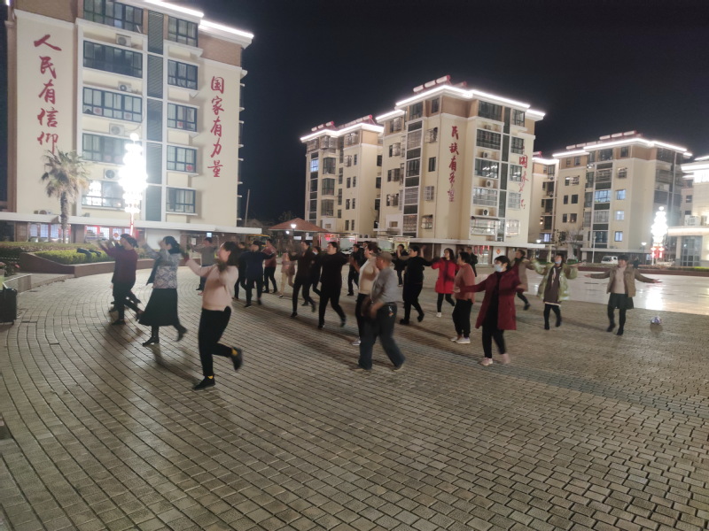 “过去他们只是坐在台下看,现在有了‘健身平台’,我们也成了主角,舞蹈能跳,广场舞更是不在话下,大家旁若无人的表演,丁点儿也不吃场,个个表演的天赋及精气神可足了。”经常带着大家编排广场舞的舞蹈教练缪士美乐呵呵地说。她脸上幸福的笑容,诠释着近年来淮海农场文化惠民工程和打造的健康体育文化,给职工群众带来实实在在的好处,也让能歌善舞成为淮海舞蹈大妈们的拿手好戏,让她们一个个地成为职工群众文化生活中不可或缺的文化艺术。各类基层文体协会汇聚了众多的文艺骨干和爱好者,他们在每年农场的广场文化节、各类文艺表演或是参与周边场乡共建文艺活动中发挥了重要作用,带动了周边职工群众共享淮海文化发展的成果,进一步弘扬军垦传统文化,同时也在大家的积极参与中,成就了淮海文化大场的美誉。图为农场夜幕下的舞蹈文化活动。