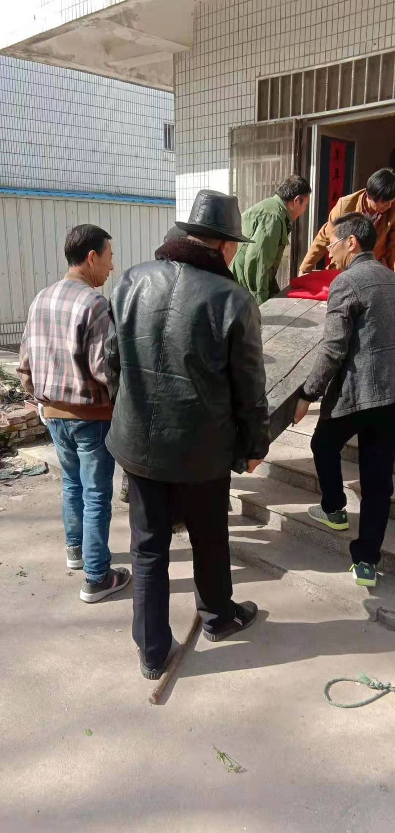 4月16日,新洋农场社区管理人员微信群里,城西居委会工作人员分享了一张照片,照片上,居委会主任蔡文良正同几位居民一起将一口棺材抬往室内,大家纷纷点赞,说这工作不容易。