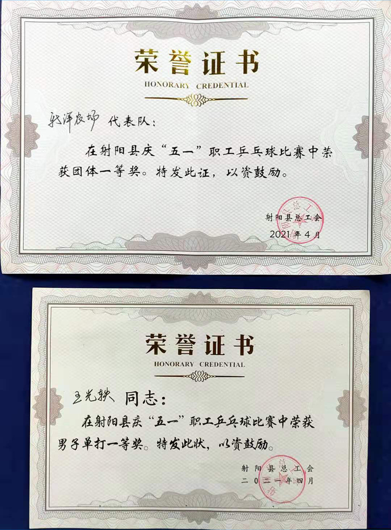 4月23日至24日,射阳县总工会举办“迎五一·庆祝建党100周年”职工乒乓球比赛。经过两天激烈角逐,新洋农场有限公司代表队选派的四位选手敢打敢拼,一路过关斩将,最终取得了团体第一名的好成绩。新洋代表队的王光轶选手同时斩获了男子单人赛第一名的好成绩。
