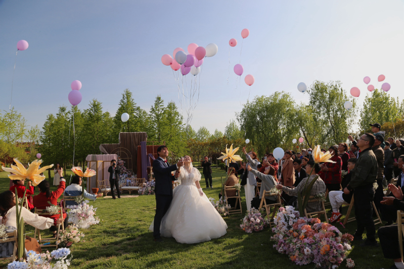 5月2日,金龙湾公园热闹非凡,一对新人正在这里举行婚礼。诺大的草坪上人头攒动,亲朋好友和乡里乡亲领略了一场别开生面的户外婚礼。