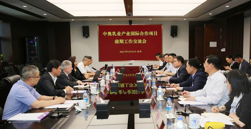魏红军首先对奥方团队一行的到来表示热烈的欢迎和诚挚的问候,对奥方在前期工作中作出的努力和取得的进展表示衷心的感谢。他说,在全球疫情尚未结束的特殊时期,奥方团队不远万里来到中国,严格遵守各项防控措施,搭建起面对面沟通交流和实地考察调研的平台,奥方的科学态度、严谨作风和敬业精神令人钦佩。特别是彼特勒教授多年来致力于中奥友谊和中欧合作,拥有35年在华国际合作项目开发经验,是一名特殊的友谊使者。他表示,疫情阻隔不了双方真诚的友谊,阻隔不了我们合作的信心。希望双方发挥各自优势,共同推进中奥乳业国际合作项目,实现携手发展、合作共赢,为巩固中奥友谊和践行“一带一路”倡议作出贡献。
