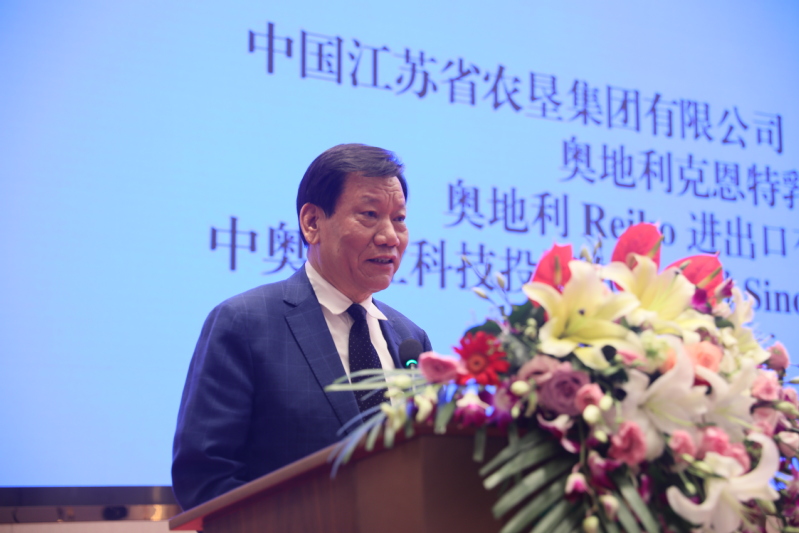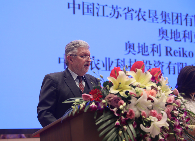 陈存根在讲话中对合作框架协议的签署表示热烈的祝贺。他深情回忆了30多年前在奥地利学习生活的经历以及后来在西北农大、杨凌农业高新区工作的情景。他表示,能够见证中奥两国在乳业合作上取得进展,十分高兴,也圆了自己的一个梦想。他认为,中国是人口大国,吃饭问题永远是头等大事,中华民族5000年文明史就是一部农耕文明史。改革开放以来,中国最大的成就是从“吃不饱”到“吃得饱”再向“吃得好”转变。“吃得好”有两层意义,一是食品安全和质量上要绿色、有机、健康,二是食物结构要调整。今天双方合作框架协议的签署对改善食品结构、提升食品质量、让中国人吃得更好具有长远和现实意义。他表示,奥地利畜牧业高度发达,技术和产品质量一流,而江苏农垦拥有政治优势、资本优势、资源优势和市场优势,合作前景广阔。期待框架协议早日开花结果、落地生根,为中奥两国食品产业交流和友谊作出更大的贡献。