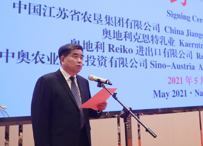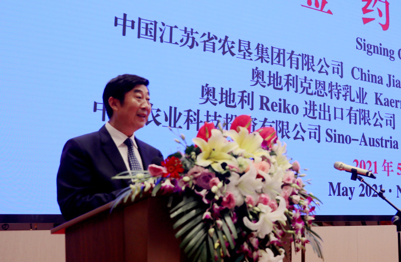 彼特勒对在江苏和南京期间中方所给予的各种支持和帮助表示由衷的感谢,并介绍了中奥乳业国际合作项目的目标和理念。他说,中国各级政府和部门在“十四五规划”中都特别重视农业问题,特别关注环保承受力和高品质的乳制品生产,既要长期应对满足一个城市,一个区域,乃至一个国家人口对奶制品的供给侧平衡,又要符合国际竞争中蓬勃发展的出口经济的国际标准。江苏农垦是一家卓越领先的大型国有公司,在开发新农业技术应用和管理系统方面拥有丰富的经验,而奥地利克恩特乳业的新鲜原奶是被评为世界上品质最好的原料奶,生产约400个不同的产品。50年前的今天,中华人民共和国与奥地利共和国正式建立外交关系。他认为,国之交在于民相亲,秉承相互尊重理解和支持的合作精神,今天的签约仪式一定会为中奥建交50周年史上增添浓墨重彩的一笔。