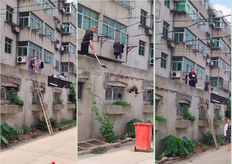 我们注意到,紧靠楼房的车库顶上,由于风雨的影响和楼上坠落的衣物衣架,一直以来积攒在车库顶上,长年累月就形成了一层看上去很不雅观的垃圾,加上清扫不便,所以这里就成了影响视觉环境的一个遗忘的角落。居住在楼上的居民,为了居住环境的更友好,于是每隔一段时间,就相约联合开展房顶垃圾的清理行动,不仅清理了自己楼下车棚顶上的垃圾,还将整幢楼的车库垃圾清理个遍,这样堆了好多年头的“顽固垃圾”不见了,重新让楼上的居民看到了楼下的”顶美“风光。