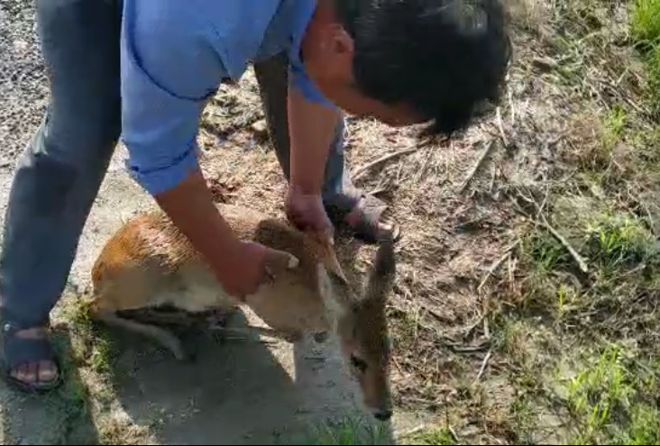 7月10日早上六点半,苏垦农发弶港分公司第一生产区2连大渠正在抽水灌溉,2大队队长陈兵在田间踏田检查时听到渠道中有动物的叫声,走近一看,发现一只獐在渠道里不断挣扎,声嘶力竭,随时有生命危险。见此情景,陈兵立即组织人手拿来绳子、框子、网等工具,经过半小时的努力,终于成功地将獐抢救上岸。通过报警求助,警察连线咨询了野生动物保护中心,在专业人士的指导下,陈兵对獐进行了简单检查和救护,发现野生獐没有大碍,立即将其放生。