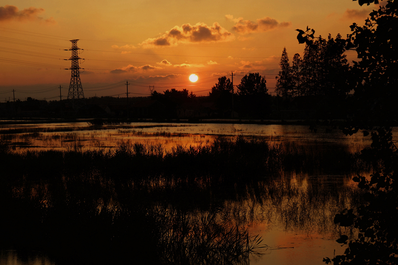 从新洋农场跨过黄沙港,紧靠北岸的兴桥镇日新村,有一处400亩左右的鱼塘,鱼塘里长满芦苇、菖蒲等水生植物,常有鸟儿飞过和栖息,野鸭也不时地在水中游弋嘻戏。这哪是鱼塘,分明是一处天然的湿地,并无人工雕琢,给人以原生态感觉。远处那高高耸立的输电铁塔,又参和进了人文的元素,自然景观与人文景观相辅相成,相得益彰。每当夕阳西下,云彩缭绕,晚霞飞红之时,那种剪影之美、湿润之美、静谧之美,美轮美奂,令人陶醉。