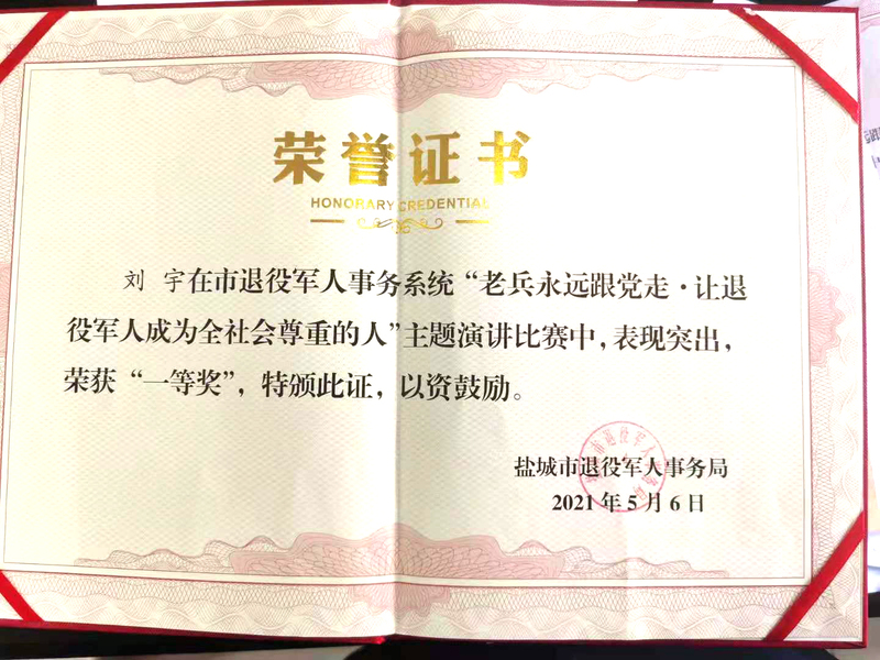 近日,农场公司财务部青年员工——刘宇在盐城举行的“老兵永远跟党走·让退役军人成为全社会尊重的人”演讲比赛中荣获一等奖。