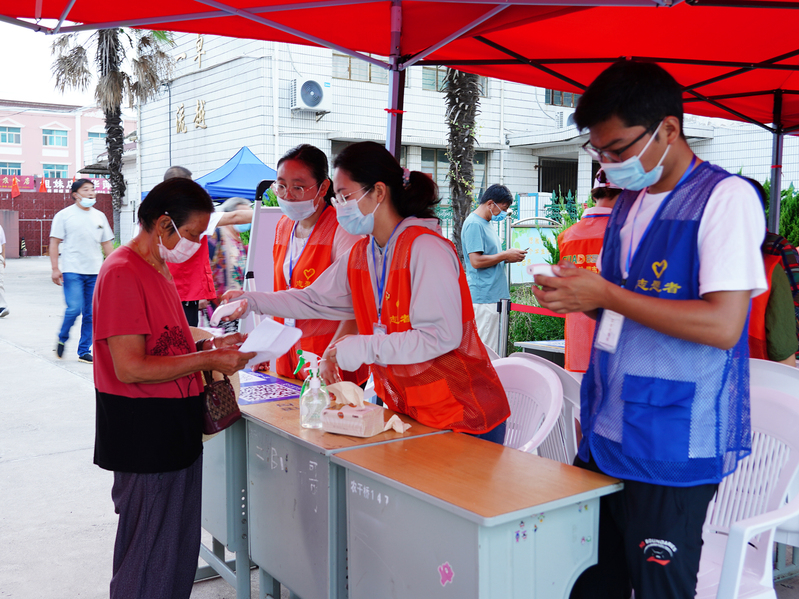 “您好,请出示您的健康码和行程码”,在测温区,志愿者们耐心地为参与演练的居民们测体温,检查健康码和行程码,用高度的责任心守住第一道关心。“老大爷,您行动不便,请走这边的专用通道”,在缓冲区,志愿者们及时引导并一趟趟搀扶老年通过专用快速进行检测。“请大家做好一米间隔,戴好口罩”,等待区内,志愿者们随时提醒排队人群做好自我防护,保障临检队伍秩序井然。炎热的天气,信息采集区身穿隔离服的志愿者们早已汗湿衣裳,却没有人喝一口水。
