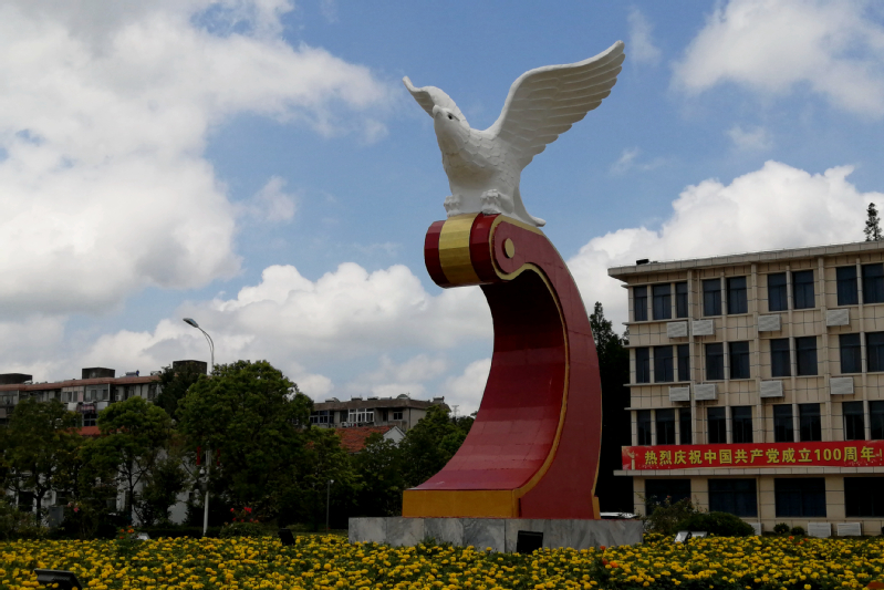 “鲲鹏展翅”是新洋标志性景点,近30年来,它激励着新洋人,不骄不躁,不满足于现状,为实现新洋梦,向着新的目标,展开腾飞的翅膀。在庆祝建党100周年之际,新洋党委将雕塑鲲鹏展翅修缮一新,大理石底座换成了红色的,象征着新洋人要传承江苏农垦的红色基因,继续发扬“艰苦奋斗,勇于奉献,开拓创新 ”的农垦精神,如鲲鹏展翅,飞得更高,飞得更远。