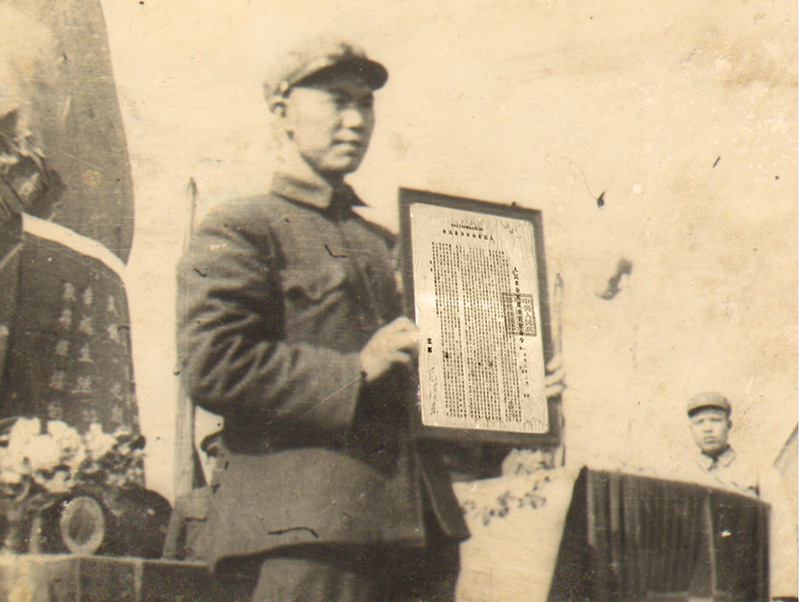 副师长李桂莲从常玉清将军手中接过命令,并代表全体官兵表示“坚决服从、坚决执行、作好生产准备,向生产战线进军”的决心。