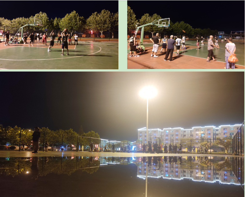 盛夏时节,虽然白天的太阳灸烤似火,但在高温的天气过后的四五点钟,淮海职工休闲体育运动广场上的篮球场上便开始活跃起来。特别是到傍晚时分和夜间九点多钟,篮球场上始终洋溢着热闹的气氛。大家在灯光下,许多篮球爱好者们,便相约来到封闭式的篮球场上,时而进场热身、时而组队比赛。在比赛间隙,我们甚至能看到有头10个篮球在同时滚动飞传。篮球,作为淮海人喜欢的一个体育运动,正成为职工居民喜爱的运动项目之一。