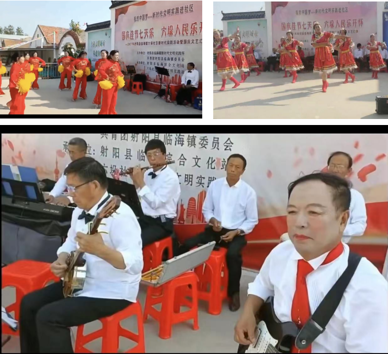 “最美的歌儿唱给妈妈”“摆动中国”这两支由淮海人奉献的舞蹈表演节目与临海镇的舞蹈队员们表演的节目穿插进行,也让当地乡镇迎来了淮海广场大场舞蹈队表演的丰采,大家在交流中表演才艺,在学习中相互促进,达到了文化融合,共同发展的目的。同时农场职工居民还通过才艺参与的形式,以笛子和吉他等器乐表演,加入到农场与六垛居委会共同组织的曲乐表演队伍中,让大家共同奏响盛世繁荣的乐章,在七天乐中享受着幸福生活带来的美妙。整场节目,既有抑扬顿挫的音乐助阵,更有多支舞蹈队的才艺表演,还穿插一些说唱的艺术,让职工居民们深深沉浸在文艺繁荣的艺术里,赢得了现场观众的高度肯定和热烈掌声,展示了农场农村一家亲和积极向上的精神风貌。