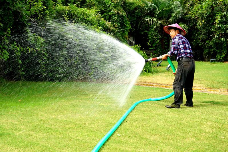 图为管护工为草地浇水