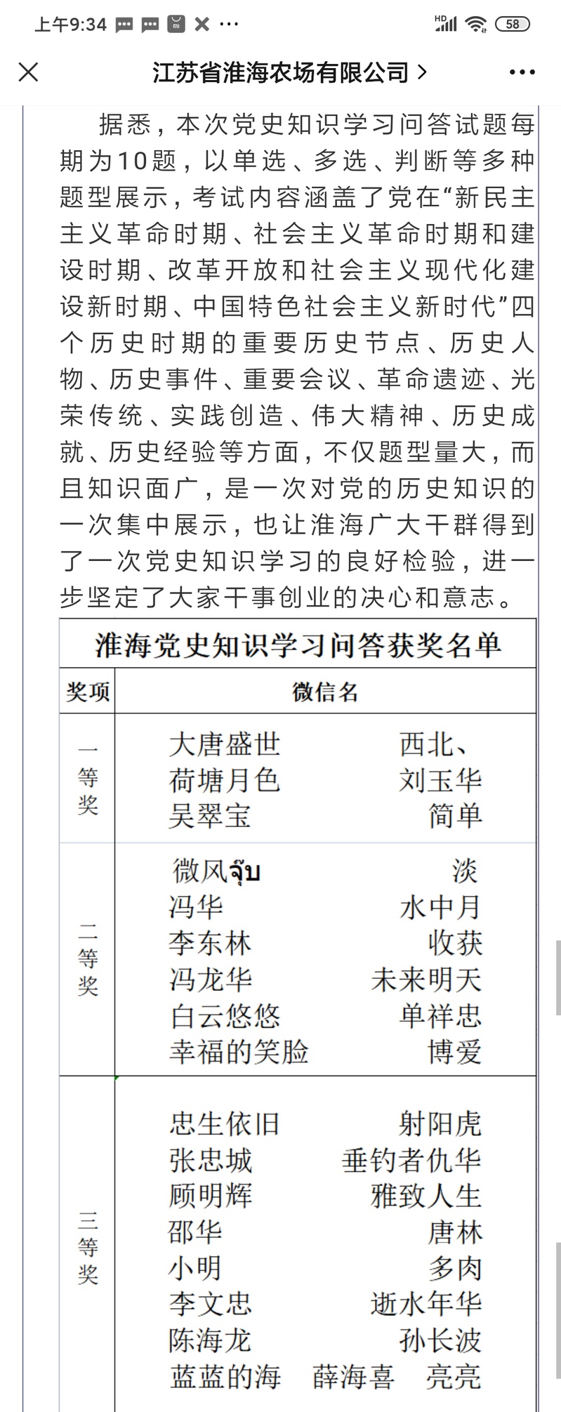 “作为农场老干部,我一直关注淮海农场的大事,这次为庆祝中国共产党成立100周年大庆,农场党委工作部去年6月1日通过微信公众号发布的答题页面进行答题活动时,我本着试试看的心理,第一次答题结束就获得了100分,让我的信心大增。”程定基在领奖名单上签上自己的名字后兴趣盎然地说,“于是在接下来的每周党史知识学习问答试题,我都是认真对待,直到推出了26期淮海党史学习教育知识问答全部结束。”